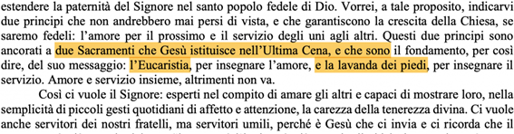 Estenderem a paternidade do Senhor no santo povo fiel de Deus. Gostaria, a tal proposito indicar-vos dois princípios que nunca deveriam deixar de falar, e que garantem o crescimento da Igreja, se seremos fiéis: o amor ao próximo e o serviço uns aos outros. Estes dois princípios estão ancorados a dois Sacramentos que Jesus instituiu na última Ceia e que são os fundamentos, para assim dizer, da sua mensagem: a Eucaristia, para ensinar o amor, e o lava pés, para ensinar o serviço unidos, caso contrário não funciona.